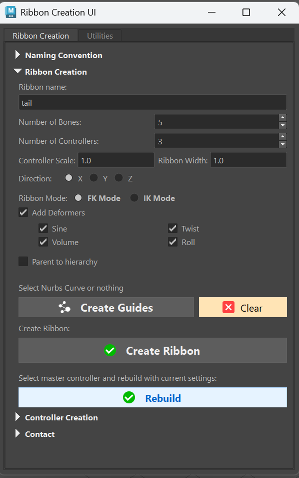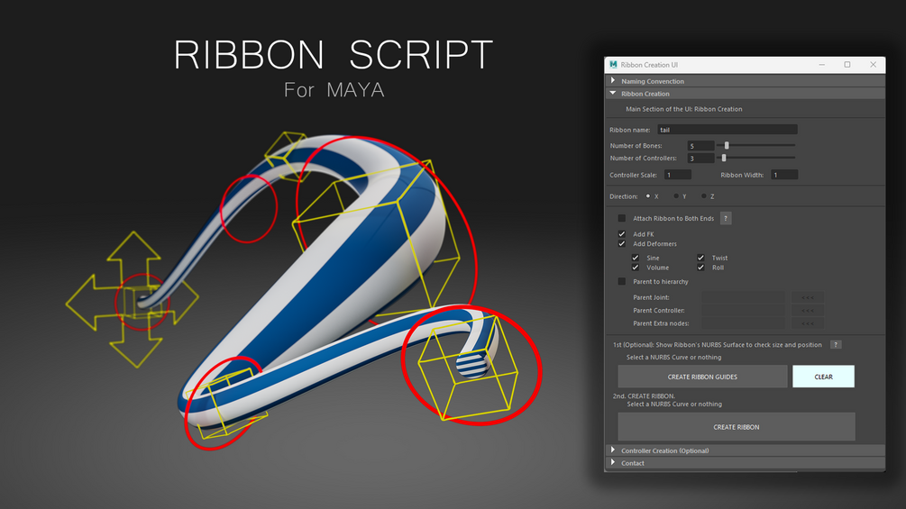 Ribbon Nacho is a professional-grade Python tool for Maya that lets you generate ribbons on NURBS curves with controller-based deformation, advanced FK/IK support, and optional deformers—all wrapped in a sleek, drag-and-drop UI.